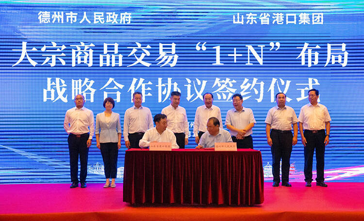 齐鲁网·闪电新闻8月20日讯 8月19日,德州市政府与山东省港口集团签署大宗商品交易“1+N”布局战略合作协议。德州市委书记田卫东,市委副书记、市长杨洪涛会见山东省港口集团党委书记、董事长霍高原一行并出席签约仪式,市领导刘长民、张安民参加有关活动。