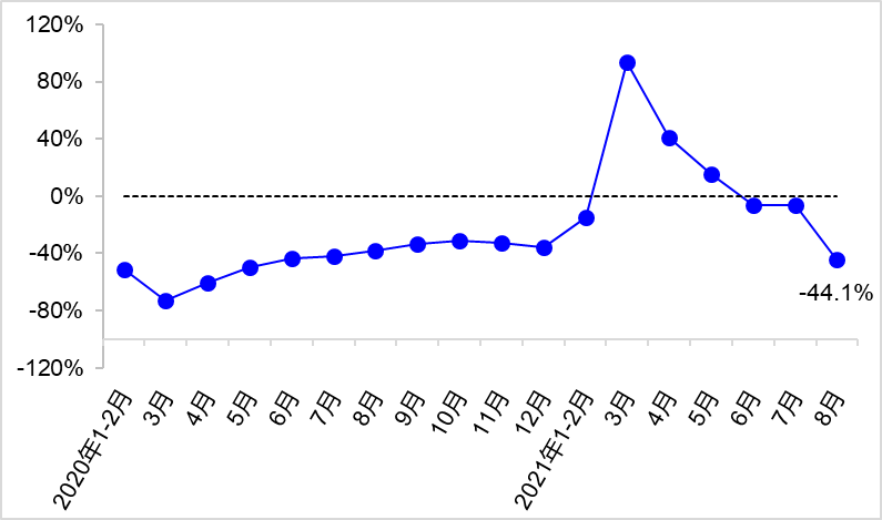 8月,完成营业性客运量5.5亿人,同比下降44.1%、降幅较7月扩大37.5个百分点,两年平均下41.0%。其中,完成公路营业性客运量3.6亿人,同比下降45.9%;完成水路客运量1012万人,同比下降43.8%。