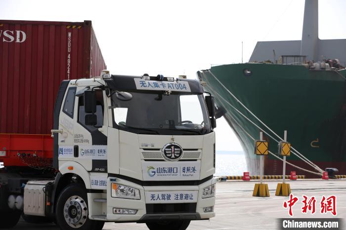 无人驾驶集装箱卡车在码头上作业。胡耀杰 摄