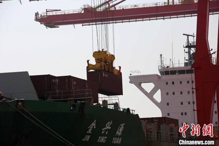 集装箱被吊起。胡耀杰 摄