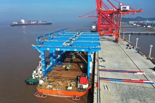 10月26日下午,宁波舟山港金塘港区大浦口码头,“振华”12轮上的四台大型龙门轨道吊正在平稳地滑移到码头上,并拖移到堆场,将与先期到港的3台远控自动化桥吊一起进行调试。