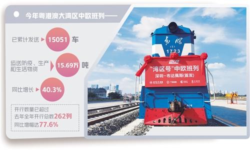 记者从广铁集团了解到,今年粤港澳大湾区中欧班列已累计发送15051车,运送防疫、生产和生活物资15.69万吨,同比增长40.3%。开行数量已超过去年全年开行总数,预计今年全年开行数量将超过350列,并有望创造全年每日开行一列的新纪录。