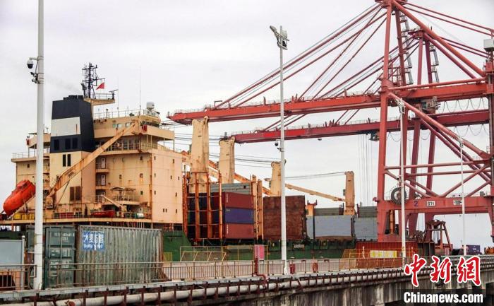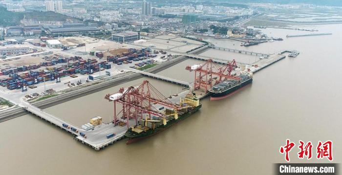中新网台州11月16日电(范宇斌 金迪 吴铭)11月16日,浙江台州玉环大麦屿港区5万吨级码头,一个个集装箱等待着被装上“塔利亚”轮。