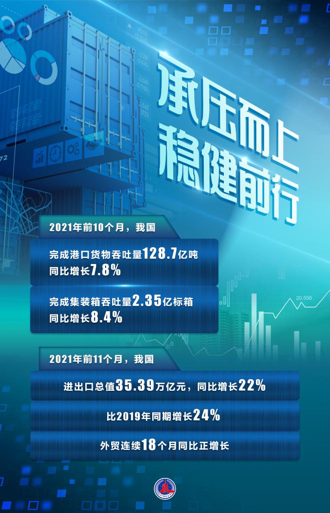海关总署数据显示,今年前11个月,中国进出口总值35.39万亿元,同比增长22%,比2019年同期增长24%,这也是中国外贸连续18个月同比正增长。