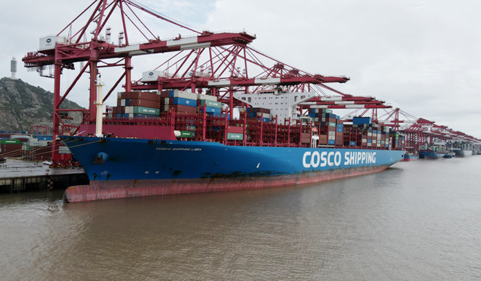 10月13日,中远海运“天秤座”轮停泊在上海洋山港二期码头(无人机照片)。 新华社记者 方喆 摄
