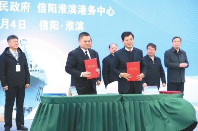 在上午举行的开航仪式中,淮滨县人民政府县长谷光亚分别与浙江海港嘉兴港务有限公司、江苏省淮安市港口物流集团、安钢集团签约。