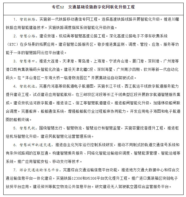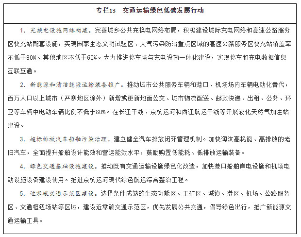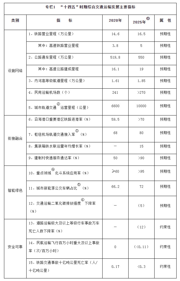 注:①〔〕内为5年累计数。②指纳入国家批准的城市轨道交通建设规划中的大中运量城市轨道交通项目。③指国际枢纽机场和区域枢纽机场中连通轨道交通的机场数量占比。④指重点营运车辆、邮政快递自有干线运输车辆、应安装具备卫星定位功能船载设备的客船及危险品船等。⑤指新能源公交车辆占所有地面公交车辆的比重。⑥指按单位运输周转量计算的二氧化碳排放。