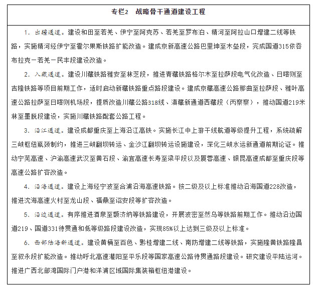 加强战略骨干通道建设。推进出疆入藏通道建设,扩大甘新、青新、青藏、川藏四条内联主通道通行能力,稳步推进川藏铁路建设,加快推进新藏铁路和田至日喀则段前期工作、适时启动重点路段建设,有序推进滇藏铁路前期工作,密实优化航空航线网络布局,构建多向联通的通道布局。畅通沿江通道,加快建设沿江高铁,优化以高等级航道和干线铁路、高速公路为骨干的沿江综合运输大通道功能。升级沿海通道,提高铁路通道能力,推进高速公路繁忙路段扩容改造,提升港口航道整体效能,构建大容量、高品质的运输走廊。贯通沿边通道,提级改造普通国省干线,推进重点方向沿边铁路建设,提高安全保障水平。建设西部陆海新通道,发挥铁路在陆路运输中的骨干作用和港口在海上运输中的门户作用,强化东、中、西三条通路,形成大能力主通道,衔接国际运输通道。