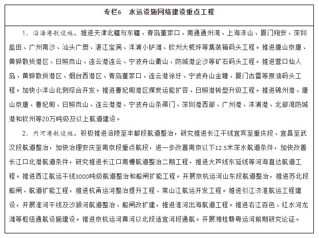优化畅通水运设施网络。建设京津冀、长三角、粤港澳大湾区世界级港口群,支持山东打造世界一流的海洋港口,推进东北地区沿海港口一体化发展,优化港口功能布局,推动资源整合和共享共用。有序推进沿海港口专业化码头及进出港航道等公共设施建设。适度超前建设粮食、能源、矿产资源的接卸、储存、中转设施,推进沿海沿江液化天然气码头规划建设。提升内河港口专业化、规模化水平,合理集中布局集装箱、煤炭、铁矿石、商品汽车等专业化码头。加强内河高等级航道扩能升级与畅通攻坚建设,完善长江、珠江、京杭运河和淮河等水系内河高等级航道网络,进一步提升珠三角高等级航道网出海能力,全面加强长三角、珠江—西江高等级航道网未达标段建设。推动重要支流航道和库湖区航道、内河旅游航道、便民码头建设。