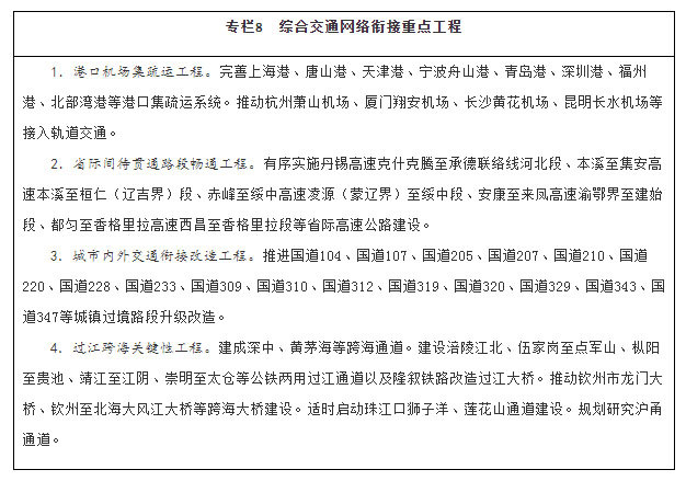 加快解决制约人民美好出行、货物高效流通的瓶颈,强化综合交通网络有机衔接。打通公路省际待贯通路段,加强干线公路与城市道路有效衔接,推进城镇密集地区干线公路过境段、进出城瓶颈路段升级改造。加强枢纽机场与轨道交通高效衔接,使换乘更加便捷。强化进港区、进园区、进厂区、进规模化农产品基地等集疏运设施建设,加快推动铁路进港口重点港区和大型工矿企业、物流园区、重点物资储备库。统筹考虑资源高效利用、生态环境保护和防洪航运安全,有序建设各种运输方式共享通道资源的过江跨海通道。推动超大特大城市的大型综合客运枢纽间通过轨道交通互连。加快实现联系紧密的综合货运枢纽间通过联络线或专用通道互连。