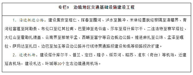 服务沿边城镇体系建设,以公路、机场为重点,大力改善边境地区交通出行条件,提升边境城镇人口集聚能力。统筹推进边境地区国省干线公路、农村公路等建设,全面完善国道干线主骨架,推进沿边公路并行线建设和低等级公路提质改造,加快抵边公路建设,尽快形成层次清晰、结构合理的沿边公路网。稳步推进边境地区机场建设,构建多层级航空网,扩大航空运输服务覆盖面。补强同江、二连浩特、阿拉山口、霍尔果斯、瑞丽、磨憨等口岸后方铁路通道能力。加强抵边自然村邮政设施建设,实现邮政服务普遍覆盖。