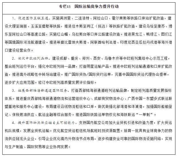升级改造中欧班列铁路口岸和后方“卡脖子”路段,加快技术装备升级和信息化建设。加快建设中欧班列集结中心,推广中欧班列统一运单和内外贸货物混编运输,提高货源集结与班列运行效率,扩大图定铁路货运班列开行范围。健全中欧班列考核评价体系,健全行业自律机制,巩固维护品牌形象,强化风险防控。推动国际铁路联运规则衔接统一,探索建立与贸易、金融联动发展新规则,推动建立中欧班列政府间合作机制。
