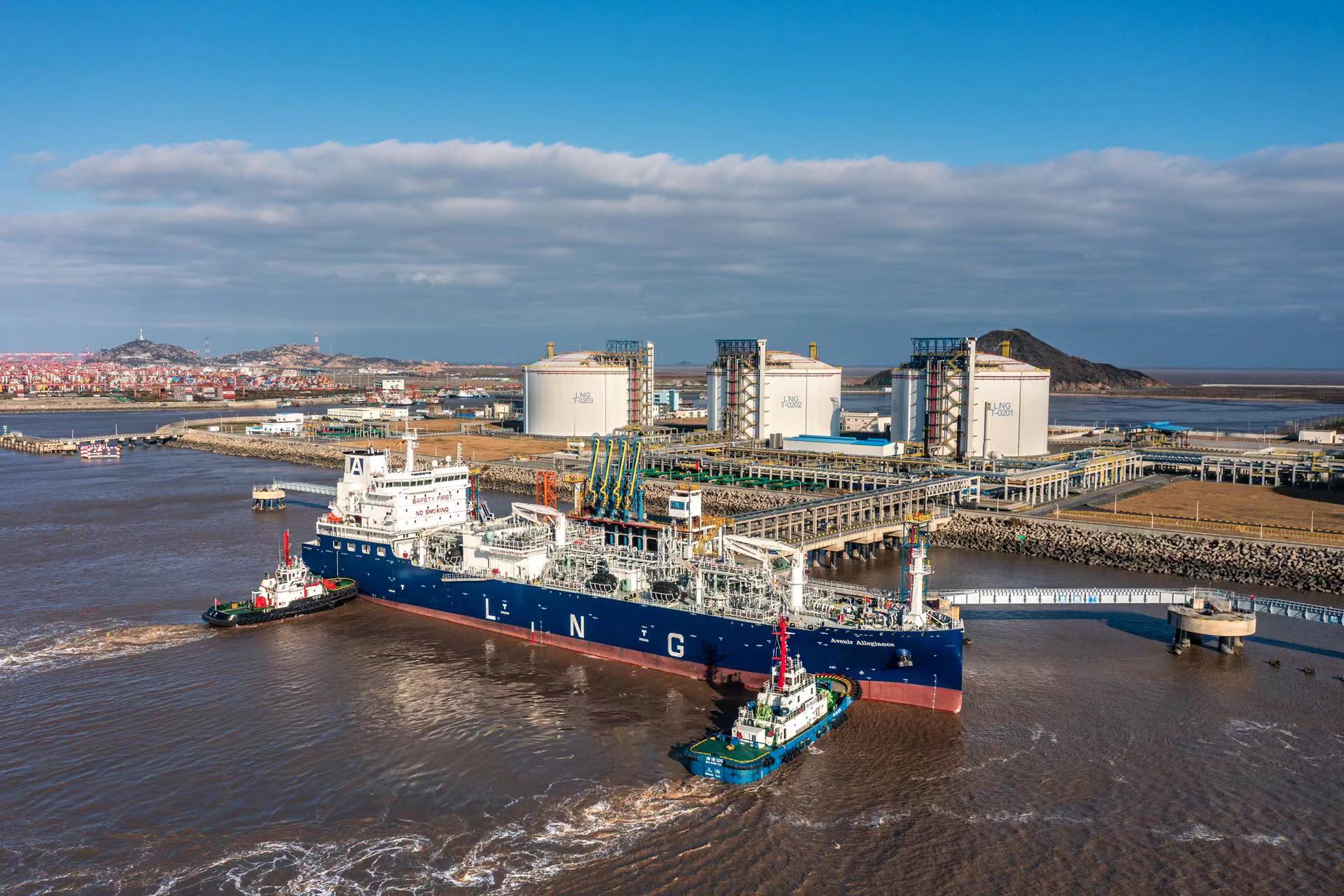 上海上港能源服务有限公司购买的全球最大型2万立方米LNG加注船“海港未来”号试靠洋山申能LNG码头