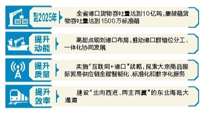 《方案》指出,到2025年,全省港口货物吞吐量达到10亿吨,集装箱货物吞吐量达到1500万标准箱;大连港集装箱货物吞吐量达到800万标准箱。全省万吨级以上泊位占比达到60%。全省港口外贸航线达到90条,内贸航线达到110条;大连港外贸航线达到80条,内贸航线达到15条。重要港区铁路进港率达到95%以上,集装箱海铁联运量达到200万标箱。