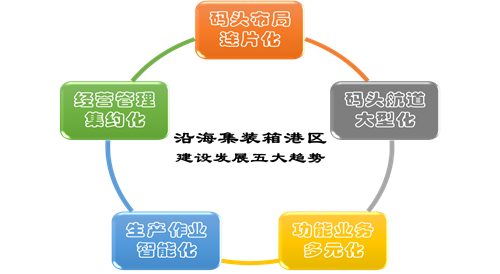 总结沿海港口(含南京以下沿江港口)集装箱码头规划建设和发展历程,可以发现沿海集装箱港区建设发展呈现码头布局连片化、码头航道大型化、功能业务多元化、经营管理集约化、生产作业智能化五大发展趋势。