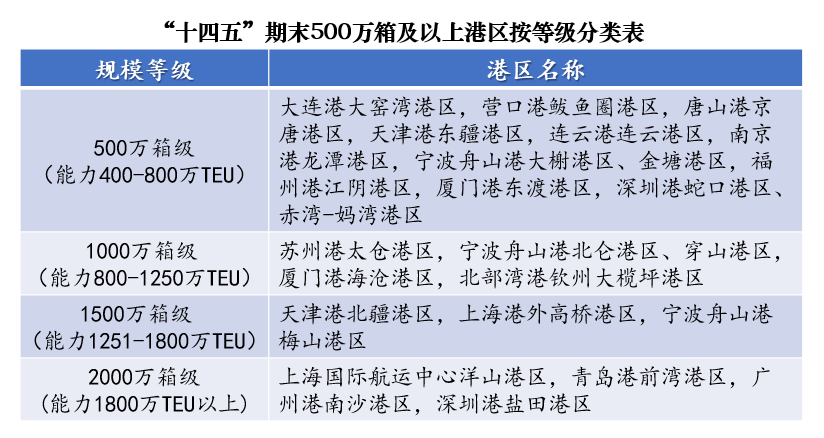 沿海集装箱港区连片化码头大多采用长顺岸、宽陆域的布置形态,水水中转比例高达60%以上的广州港南沙港区采用长顺岸结合中间驳船小港池的布置形态。码头布局连片化催生了一批规模化集装箱港区,根据沿海干线、支线港码头生产实际,剔除超负荷运转因素,按照考虑技术进步、增配设备、规模效应充分发挥等因素后的码头核算能力,预计到2025年底,全国沿海将建成12个500万箱级(能力400-800万TEU)港区、5个千万箱级(能力800-1250万TEU)港区、3个1500万箱级(能力1251-1800万TEU)港区和4个2000万箱级(能力1800万TEU以上)巨型港区(详见下表),沿海集装箱港区码头布局连片化、规模化发展持续深入。
