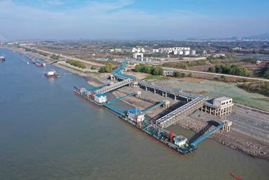 2020年4月25日,经过8个月的建设,长江流域首个巨型“胶囊式”全封闭散货料仓正式投入运营。“胶囊”仓库长470米、宽110米、高46.5米,堆场铁矿石静态储量可达31.4万吨,具有全封闭、设备新、工艺优、无污染、装卸能力强、覆盖范围广等特点,彻底解决了扬尘、污水等环境污染问题。