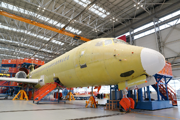 ▲中国商飞上海飞机制造有限公司总装车间内的国产ARJ21飞机。记者 丁汀 摄