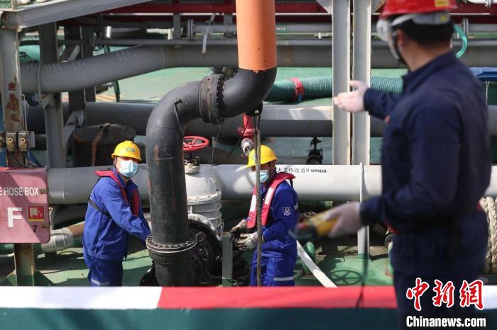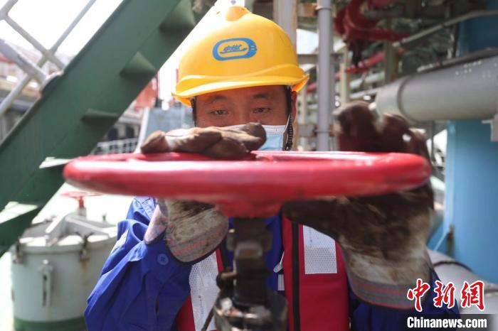 22日,中新网记者实地探访上海中燃仓储公司码头,作为上海中燃船舶燃油保供的主力船只,中燃32轮当天恰好在港口停泊装油。在中燃32轮上眺望,远处的外高桥港口一片繁忙,“我们刚从舟山地区油库运油回来,后面还有新的任务。”中燃32轮船长夏戟告诉记者。