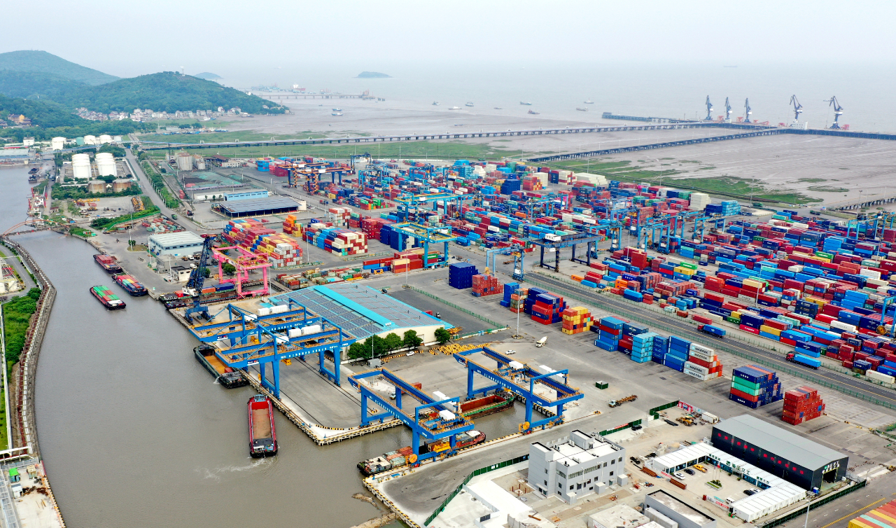 图为嘉兴港务乍浦港区海河联运作业场景。(顾佳辰/摄)