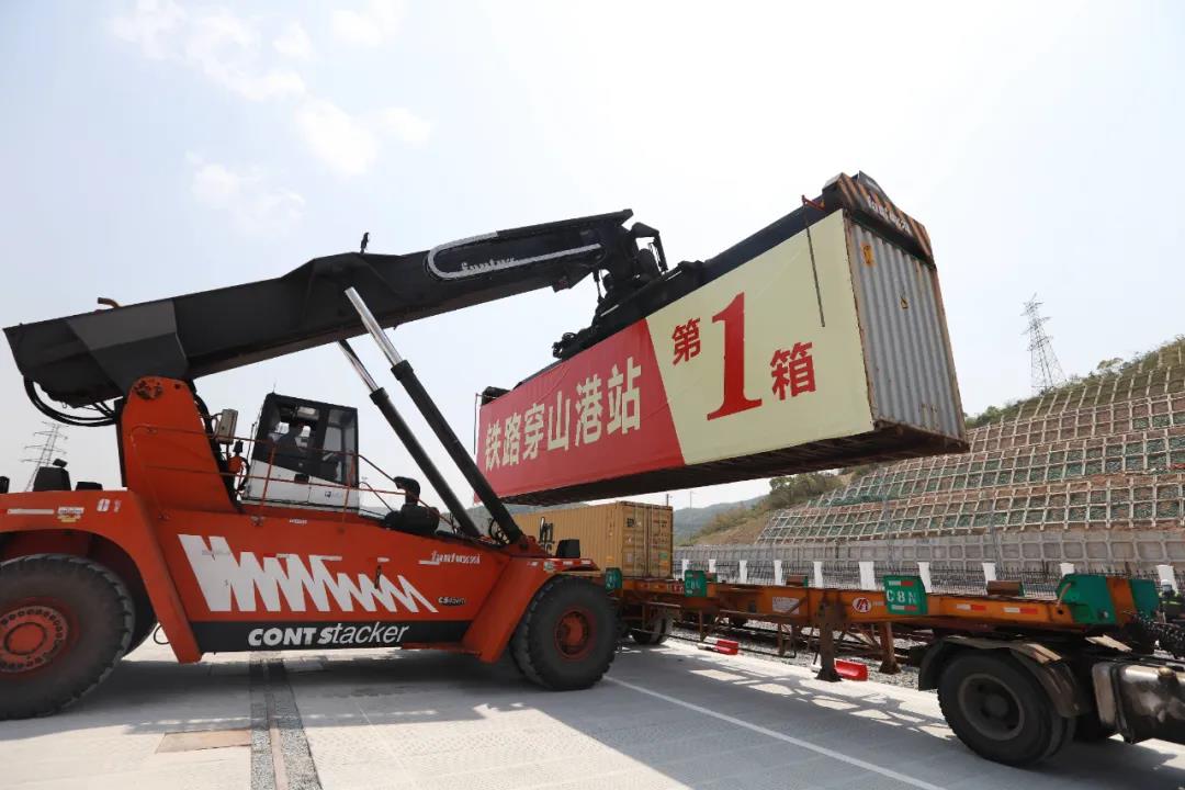 铁路穿山港站是宁波穿山港铁路支线配套工程,该铁路支线由中国国家铁路集团与宁波市人民政府共同出资建造。该站先期设计4条到发线和2条装卸线,配备4台轨道式龙门吊,1台调车机车,可满足海铁联运集装箱整列取送和装卸,近、远期设计海铁联运作业能力分别为60万标准箱和80万标准箱,它将大幅提升宁波舟山港海铁联运作业能力,为后续快速发展提供更有力的支撑。据悉,此次抵达铁路穿山港站的“湖州-宁波舟山港”海铁联运班列运载着92标准箱中国制造的家具、办公椅,将在宁波舟山港穿山港区等几大港区搭乘国际班轮运往“一带一路”沿线德国、比利时等国家。