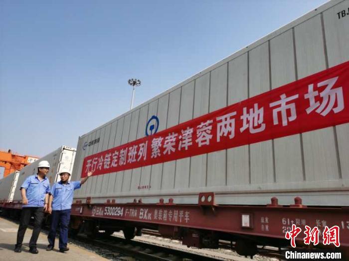 中新网天津7月16日电(记者 张道正 通讯员:岳阳、何珊珊、李楠)7月16日10时30分,编有8辆冷藏集装箱46112次货物列车,满载肉类、蔬菜从中国铁路北京局集团有限公司京铁物流中心天津集装箱中心站发出,驶向成都市城厢火车站。这是天津港区开出的首趟整列冷藏集装箱货物铁路班列。