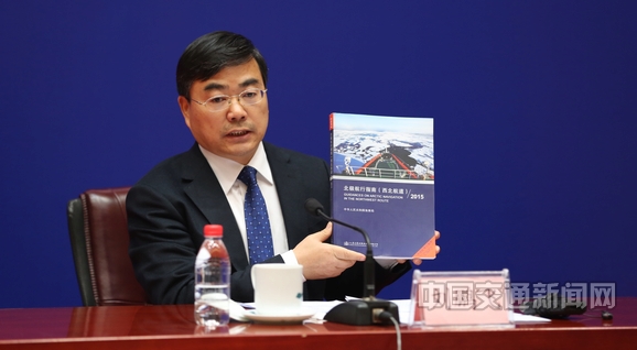 交通运输部新闻发言人刘鹏飞展示《北极航行指南(西北航道)2015》。