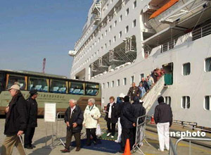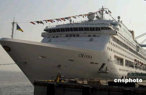 2月14日晨,从香港来沪的百慕大籍国际豪华邮轮"奥丽埃纳"号驶抵上海港外高桥码头。该轮满载二千多名海外游客,是上海在中国农历鼠年迎来的首个国际豪华邮轮旅游团。他们将前往上海豫园、玉佛寺等地体验中国传统春节的"中国年味"。据悉,2008年已有三十四艘次国际邮轮排定访沪航程表,豪华邮轮纷纷抵沪将带旺上海邮轮经济的发展。 中新社发 陆从兵 摄
