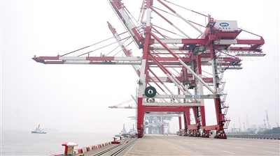 7月13日,位于外高桥的上港集团振东集装箱码头上,桥吊正在装卸集装箱货物。记者王 晋摄
