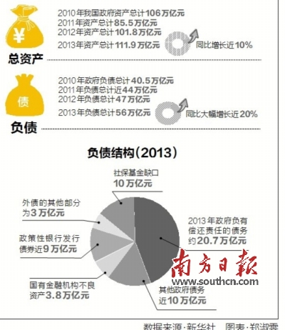 社科院财经战略研究院研究员杨志勇表示,数据显示,我国的资产规模大、情况良好,足以应对政府债务。谈及2013年政府债务同比增幅近两成的原因,他表示地方政府债务的攀升可能是重要因素。