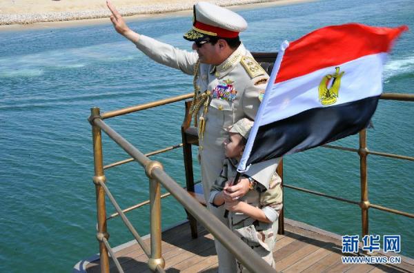 据中国之声《新闻纵横》报道,塞西在现场发表讲话称,新运河是埃及人民经过不懈努力给予世界的赠礼。随后两艘巨大的船舶沿着新老运河河道相向而来,在一片欢呼声中同时通过运河,这标志着耗时一年的庞大工程正式竣工投入使用,现场到处都飘扬着埃及的国旗,空中还飞过埃及近期从法国购入的法国阵风战斗机和美国 F-16战斗机以表庆祝。