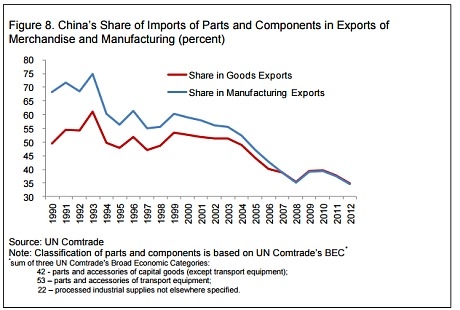 随着中国科技的进步,中国出口行业对进口零部件的依赖水平从1992年的75%,下滑至如今的35%。中国政府正努力使经济由重工业和大规模生产拉动,转为更成熟的服务型经济。