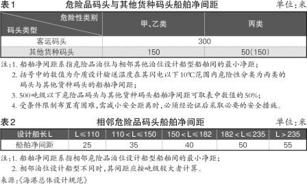 相较其他码头,根据不同品类危险品,《规范》对危险品码头的各项安全间距进行了更高标准的要求。其中,规定装卸甲、乙类危险品的泊位与明火或散发火花场所的防火间距不应小于40米;甲、乙类危险品码头前沿线与陆上储罐的防火间距不应小于50米;陆上与装卸作业无关的其他设施与危险品码头的间距不应小于40米;装卸甲、乙类危险品泊位与锚地的距离不应小于1000米,丙类危险品不应小于150米。(见表1、2)