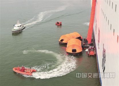 随着船长一声令下,船舶左右两舷共8只救生筏陆续被抛入海中,4套垂直撤离滑道已经打开并自动充气,乘务员逐一检查救生衣穿着情况,通过扩音器向旅客讲解注意事项和动作要领,安排部分旅客登救生艇,其他旅客则通过垂直撤离滑道撤离。