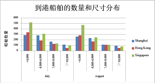 图3:七、八月上海港、香港港和新加坡港的到港船舶数量和尺寸分布
