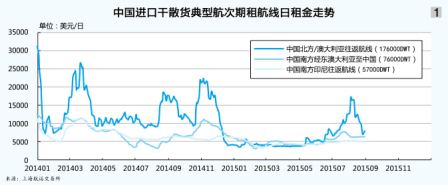 从上海航运交易所发布的中国进口干散货典型航次期租航线日租金走势图和中国进口干散货典型程租航线运价走势图(见图1、2)来看,相比去年,今年的租金走势明显下跌,尤其是前7月。