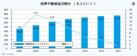 全球干散货海运贸易量在2010—2014年分别达到36.05、38.41、40.99、43.33和45.51亿吨,2011—2014年的市场同比增长率分别为6.55%、6.72%、5.71%和5.03%。克拉克森预计2015年全球干散货海运贸易量为45.80亿吨,同比增长0.64%(见表2)。