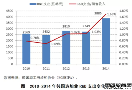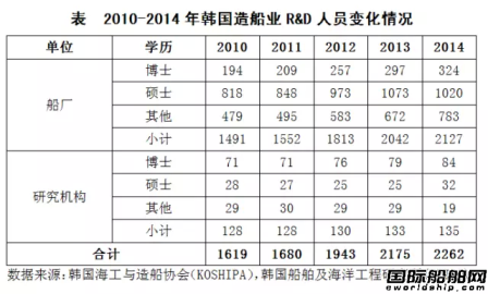 CSIRC 近年来,尽管面临造船市场恶化和企业经营业绩下滑的不利影响,韩国造船业仍然加大技术研发投入。韩国海工与造船协会(KOSHIPA)公布的数据显示,韩国2014年造船研发投入3885亿韩元(约合3.3亿美元),年末研发人员2262名,均创历史新高。