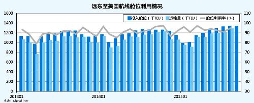 《航运交易公报》2015年第39期 与亚欧航线量价齐跌的态势相比,美国航线今年以来表现好于市场预期,远东至北美航线舱位利用率维持在90%以上