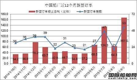 国际船舶网 据克拉克松统计,2015年9月,中国船厂新接接单为53艘,167.0万CGT,环比上升了159.6%,同比上升了44.8%; 2015年1-9月,中国船厂接单量为654.1万CGT,较2014年1-9月同比下降了51.7%。