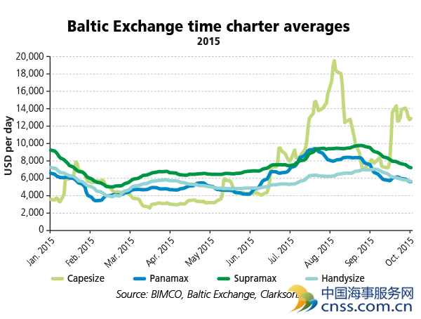 同时,“所有船型的干散货运费在2015年都处于低迷状态,仅仅好望角型船在七八两月有个短暂的飙升。2015年的前八个月中,灵便型船平均运价和好望角型船的平均运价分别为每天5605美元和8163美元。跌破底线的运价市场是由需求疲软和产能过剩双重因素导致的。不幸的是,想要改善目前现状并不容易:中国目前进入了转型阶段,对干散货航运业并不热衷。产能过剩已经持续了好些年。因此,现在是改变需求的时候了。干散货的需求并非航运业所能控制,然而到目前来看,这已然成为干散货市场复苏与否的核心环节。