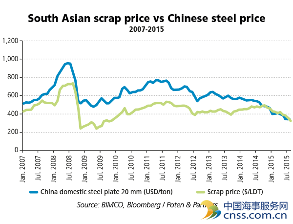 此外,中国钢铁正在大量以折扣价出口。而这些进口钢铁的国家一度倾向于购置废钢。这意味着随着交易量的降低,废钢的价格正在不断下跌。在七八两个月中,只有37艘船交付使用。目前船东和运营商仍然面临着交易现状的巨大挑战。在新造船合同的法律约束范围内,所有能够推迟新船交付的方法都已被派上了用场。在新船建造后期与船厂交涉显然不易,好在结果都比较明确。2015年船舰增长仅为4900吨载重,船舰增长2.5%,为近十年来的最低值。