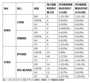 货讯通分析了2015年8月15日至9月15日期间,各联盟在4个港口的船舶到港情况。通过分析船期数据,以及比较船舶的实际到港时间和承运人公布的预计到港时间,发现这4个港口一共发生了191次独立的船舶到港。平均来说,所有船舶到港次数中有13%出现延迟超过12小时;只有3%的延迟是超过24小时。