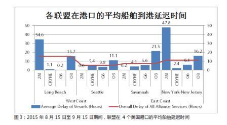 货讯通分析了各联盟所有到港延迟情况的平均船舶到港延迟时间。图3显示了4个港口详细的平均延迟时间(单位:小时)。