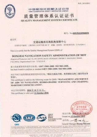 为全面推进海事“三化”建设,规范内部管理,构建布局合理、层次分明、功能完善、性能可靠的综合航海保障体系,有效履行海事航标建设养护、港口航道测量绘图、水上安全通信、航海图书资料发行等技术支持和服务保障职责,为海事行政执法、航运经济发展及其他海洋活动提供更为全面、及时、优质的综合航海保障服务,东海航海保障中心自2013年开展了导入ISO9001:2008质量管理体系工作,2014年完成了内审人员培训和体系手册的编写、完善。2015 年1月1日,中心质量管理体系正式开始试运行,7月至8月开展了内审及外审考评,并顺利通过了中国船级社质量认证公司认证。2015年10月12日,中心正式获得ISO9001质量管理体系认证证书。