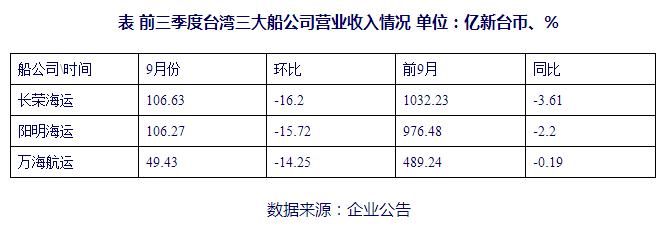 前三季度,台湾地区三大船公司营业收入均以下跌收场。长荣海运实现营业收入1032.23亿新台币,同比下跌3.61%,其中9月份环比降幅达16.2%;阳明海运实现营业收入976.48亿新台币,同比下跌2.2%,其中9月份环比降幅达15.72%;万海航运实现营业收入489.24亿新台币,同比微跌0.19%,其中9月份环比降幅达14.25%(见表)。