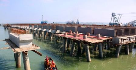目前,这项由中交三航局承建的起步码头工程,克服多次台风影响,提前8天完成沉桩。转入水上施工后,采取阶梯式流水作业方式施工,有序进行下横梁、纵梁吊装和两座引桥面板铺设的施工,各分项工程进展顺利,现已完成工程量近70%,各项指标均在可控范围之内,码头水工结构预计明年三月完工。