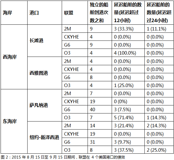 通过2015年8月15日至9月15日期间数据分析,四大联盟(马士基和地中海航运组成的2M联盟;由中远集运、川崎汽船、阳明海运、韩进海运和长荣组成的CKYHE联盟;由美国总统轮船、赫伯罗特航运、现代、商船三井、日本邮船会社和东方海外组成的G6联盟;以及由法国达飞海运集团、中国海运集团和阿拉伯轮船组成的O3联盟)在西岸的长滩和西雅图港、东岸的萨凡纳和纽约-新泽西港4个港口的船舶到港情况。通过分析船期数据,以及比较船舶的实际到港时间和承运人公布的预计到港时间,发现这4个港口一共发生了191次独立的船舶到港。平均来说,所有船舶到港次数中有13%出现延迟超过12小时;只有3%的延迟是超过24小时。