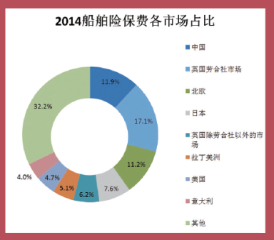 从2014年全球船舶险发展的数据来看,船舶险相比货运险而言业务更加集中。按区域统计,目前中国是全球第二大船舶险市场(市场占比11.9%),仅次于英国劳合社(17.1%)之后,其他主要市场还有北欧(11.2%)、日本(7.6%)、英国除劳合社以外的市场(6.2%)、拉丁美洲(5.1%)、美国(4.7%)、意大利(4.0%)。前八大市场的市场份额高达67.8%。