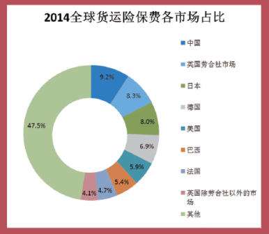 IUMI统计数据显示,2014年全球货运险保费收入169.5亿美元,同比下降7.1%。2014年中国已跃居全球第一大货运险市场(市场占比 9.2%),紧追其后的为英国劳合社市场(8.3%)、日本(8.0%)、德国(6.9%)、美国(5.9%)、巴西(5.4%)、法国(4.7%)、英国除劳合社以外的市场(4.1%),全球前八大市场占全球市场份额52.5%。